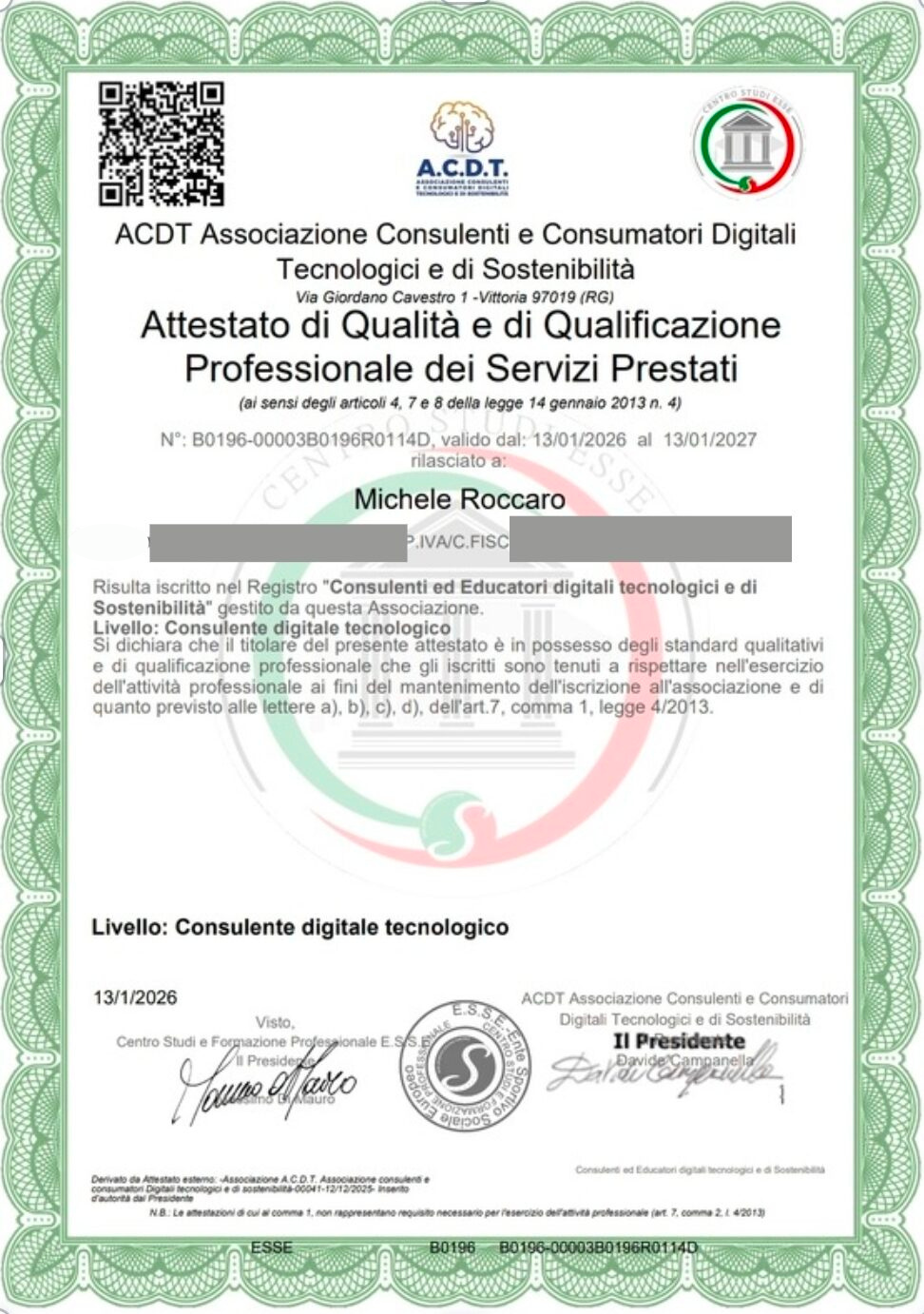 Cerchi un consulente per strategie digitali che offra consulenza digitale per privati a Ragusa, Sicilia e tutta Italia? Michele Roccaro aiuta aziende e professionisti a migliorare la presenza online, pianificare la trasformazione digitale e orientarsi tra certificazioni e qualificazioni. Un supporto pratico per navigare verso il digitale con obiettivi chiari e strategie efficaci.